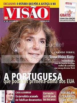 A Visão apresenta, na capa, a senhora Kerry. Mais exactamente Teresa Heinz Kerry, referenciada como "A Portuguesa que pode ser primeira-dama dos EUA". Nasceu, efectivamente, em Moçambique e lá passou uma boa parte da vida, mas esta senhora não é portuguesa. Já teve a nacionalidade lusa, mas abandonou-a em 1971. Aliás, ela nunca gostou de Portugal, tendo apenas passagens efémeras pelo nosso país. Se não acreditam, tentem encontrar uma referência a Portugal na sua biografia que consta do site oficial da campanha do marido... Na própria Visão se relata uma recente passagem pela comunidade portuguesa de Newark, que deixou todos estupefactos pelo seu comentário "sinto-me afro-americana". Claro que os portugueses não gostaram: " se ela não se sente portuguesa o que é que veio aqui fazer?". Mas nada disto releva. O que nós queremos poder dizer é que "ela é portuguesa", não o sendo.