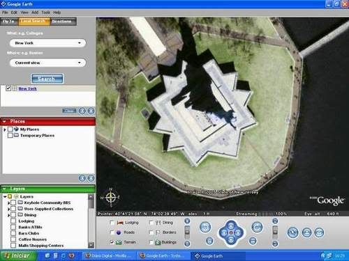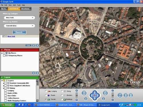 Ando completamente apanhado pelo Google's Earth (clicar no logo). Trata-se de um aplicativo, com cerca de 10MB, que terá de ser descarregado para o computador e instalado. Depois, cria uma espécie de browser que nos permite voar, literalmente, por todo os locais da Terra. Depois de escolher o ponto que se quer ver, é ir procedendo a um zoom progressivo sobre esse local e verificar até onde vai a definição. Todo o planeta está fotografado, mas, com um mínimo de pormenor, apenas uma pequena parte, normalmente zonas urbanas. A cidade do Porto já está abrangida, como se pode ver pela fotografia, abaixo, da Rotunda da Boavista, com a Casa da Música ainda em construção. Vila do Conde ainda não. Outro exemplo, a Estátua da Liberdade, em Nova Iorque, onde se conseguem contar os visitantes que a rodeiam. Chamo a atenção que estas três imagens são meros print screens e estão em baixa resolução.