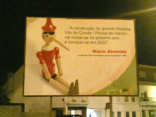 O "nocturno" PM voltou a enviar-nos material. Desta vez é o novo cartaz da JSD. Trata-se da recuperação dos 'Pinóquios' usados na última campanha. Atendendo ao que lá está escrito, é caso para dizer: "ideia velha para promessa antiga". Se bem que o incumprimento desta promessa não seja culpa exclusiva da autarquia.